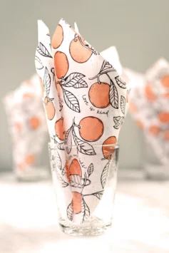 Pappersservetter med tryck i orange och mörkgrått.