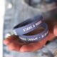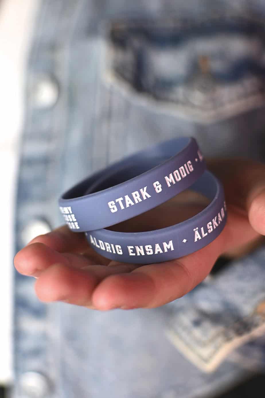 Snyggt, mjukt armband med vit text präglat ner i armbandet.
