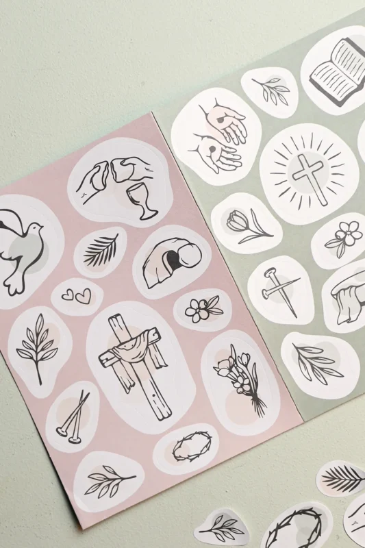 Detta ark är fullt av bilder med anknytning till påsken. Kors, duvor, spikar, törnkrona, brödsbrytelse, sårade händer, en tom grav, blommor, blad och palmkvistar.