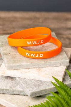 Snyggt, mjukt armband med vit text präglat ner i armbandet.